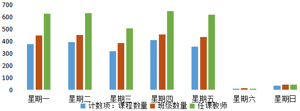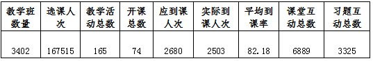 我校师生在雨课堂平台使用情况,根据大数据统计,由此查看本周教学班数量、教学活动总、开课总数、应到课人次、实际到课人次、课堂互动总数、平均到课率、习题互动总数,详情见下表:
