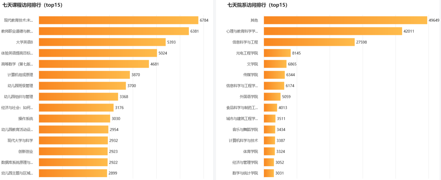 根据超星平台提供的大数据分析,可以查看本周课程打开次数、课程访问排行、较为频繁的活动类型、活跃度最高的院系和学习端口占比分别为: