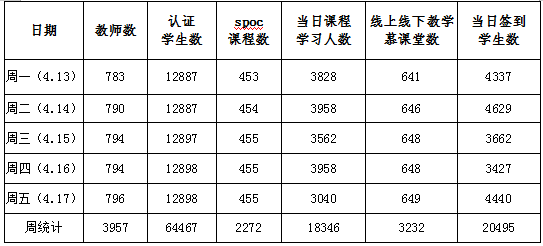 本周运行课程累计2272门次,上线教师数3957人次,认证学生数64467人次,当日课程学习累计18346人次,线上线下教学慕课堂数3232。