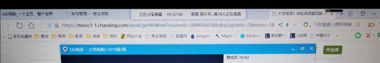 本学期王老师主要承担2019级音2和2019级信食(春)两个班的大学英语教学工作。《大学英语2》课程为19级本科开设的通识教育必修课,旨在继续提高学生的英语应用能力,增强跨文化交际意识和交际能力,同时发展自主学习能力,提高综合文化素养,使他们在学习、生活、社会交往和未来工作中能够有效地使用英语,满足国家、社会、学校和个人发展的需要。为了实现教学目标,结合现下实际情况,在开展线上课程时主要依托《大学体验英语(第四版)》教材及其配套的学习平台iSmart保障学生有材料可学,又根据学生的学习习惯和学习特点,采用“QQ群直播屏幕分享”的方式进行在线授课,最后通过超星学习通建构完整的课程方便学生课后复习、下载学习材料。
