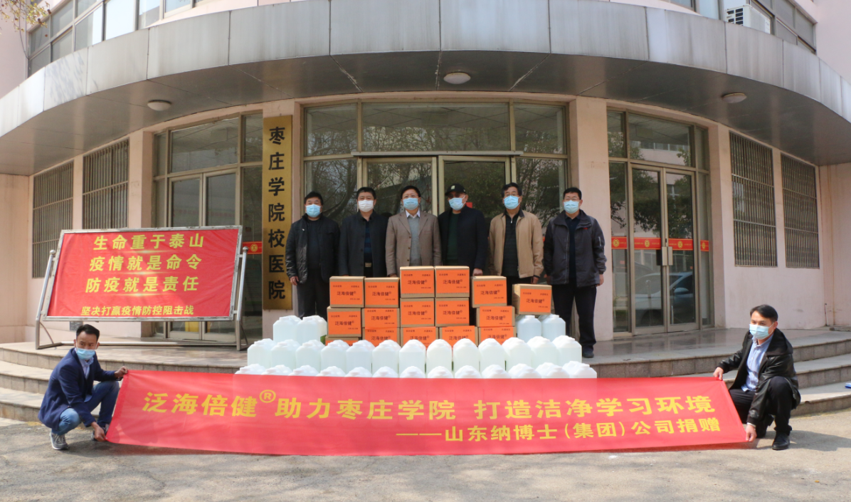 齐心协力战疫情,爱心企业在行动。4月3日上午,山东纳博士(集团)公司和山东麦德生物科技有限公司共同向我校捐赠了防疫物资一宗,包括240瓶(500ml/瓶)和30桶(25l/桶)新型抗菌抗病毒消毒剂。DB中国旗舰官方网站副校长李目海、纳博士(集团)公司董事长王汉领、麦德生物科技有限公司经理赵珽出席捐赠活动。办公室、国有资产管理处、后勤服务处等部门主要负责人参加捐赠活动。