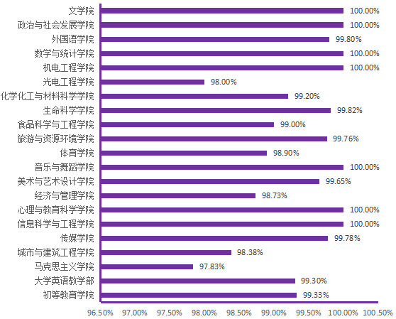 各院(部)的开课数、开课门次、班级数、教师数(人次)、学生数(人次)和学生上课率情况如下图所示: