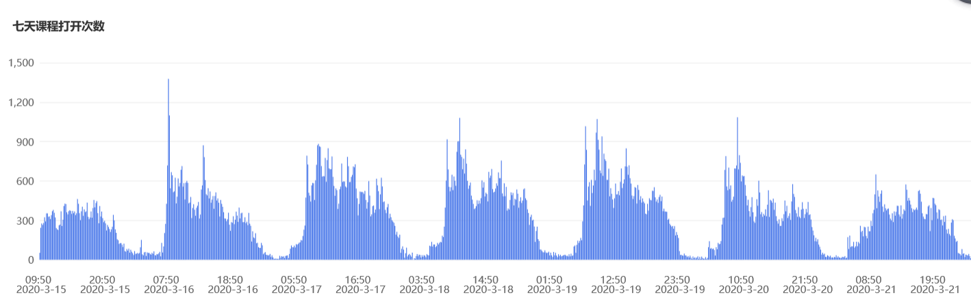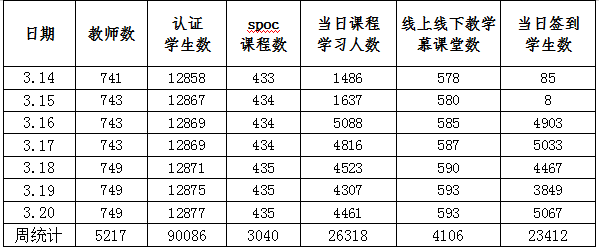 一周来,线上教学课程1093门、达3100门次;参与授课教师数824人,涉及教学班级周和2206个,学生学习人次达163999;累计上线学习学生人次数占累计应上线学习人次数比例为99.20%。