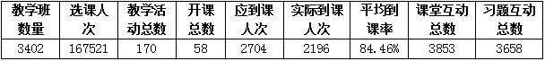 我校师生在雨课堂平台使用情况,根据大数据统计,由此查看本周教学班数量3402个、教学活动总数170、开课总数58门、应到课人次2704、实际到课人次2196、课堂互动总数3853、平均到课率84.46%、习题互动总数3658,详情见下表: