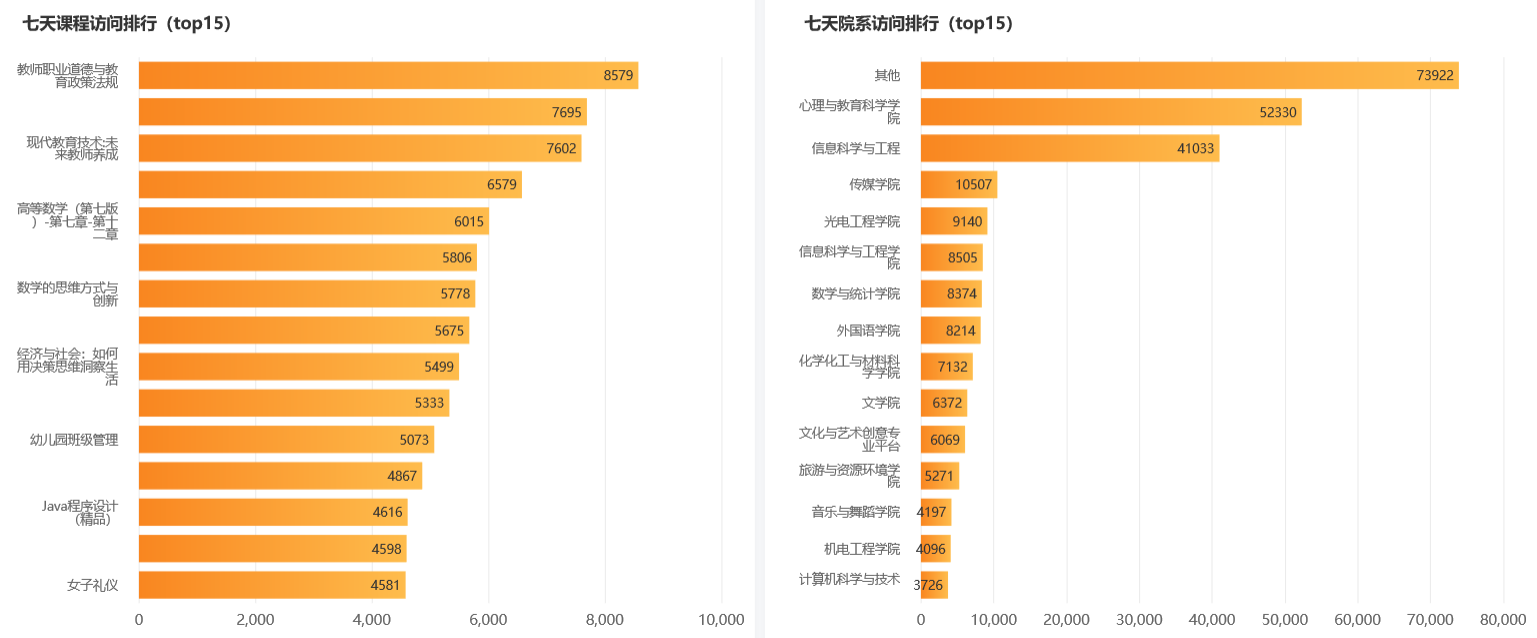 根据超星平台提供的大数据分析,可以查看本周课程打开次数、课程访问排行、较为频繁的活动类型、活跃度最高的院系和学习端口占比分别为: