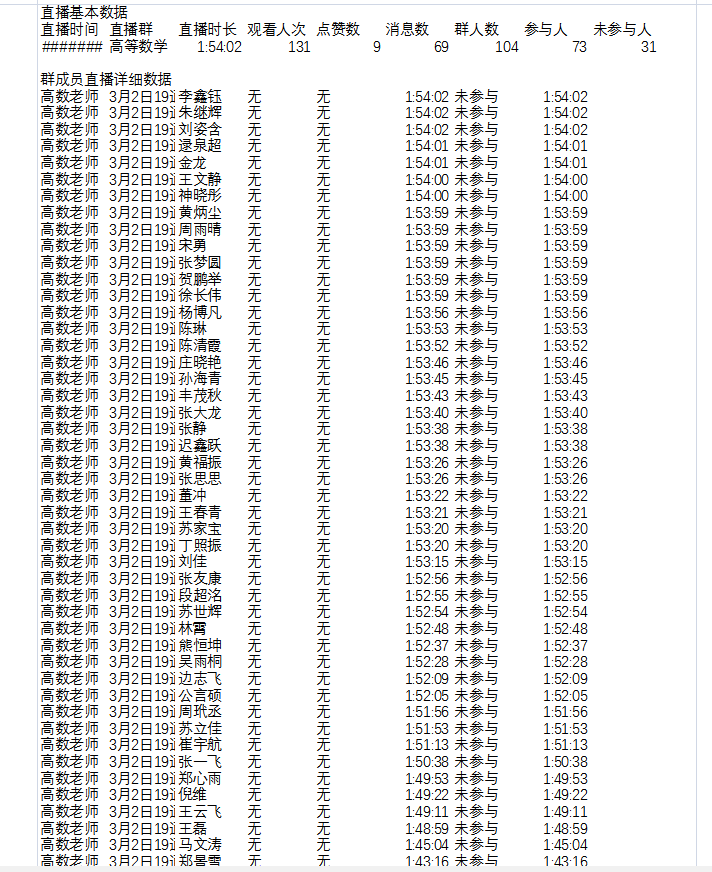 为了迎接2月17日早上3-4节的高等数学第一堂直播课,两周前就开始制定在线教学计划、考核标准、课程说明、建议学生的学习流程等。为了保证教学质量,提前在班级微信群和在线教育综合平台进行发布,同时还公告了拟定的线上线下的混合新教学模式,并将教材电子版、课外练习题及参考答案、精选慕课等教学资源提前分享给学生,用于学生线下课前预习以及课后温习课程内容。