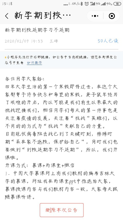 因为新冠肺炎疫情的爆发,2020年的寒假异常漫长,甚至有点艰难。对于2019级大一新生来说,寒假本可以放飞一下自我,因为疫情却只能呆在家里。我每天都会关注全国的疫情走势,并与学生交流谈心、安慰他们不要焦虑。在与所带班级学生充分沟通交流后,我们定于正月十六开始线上教学。