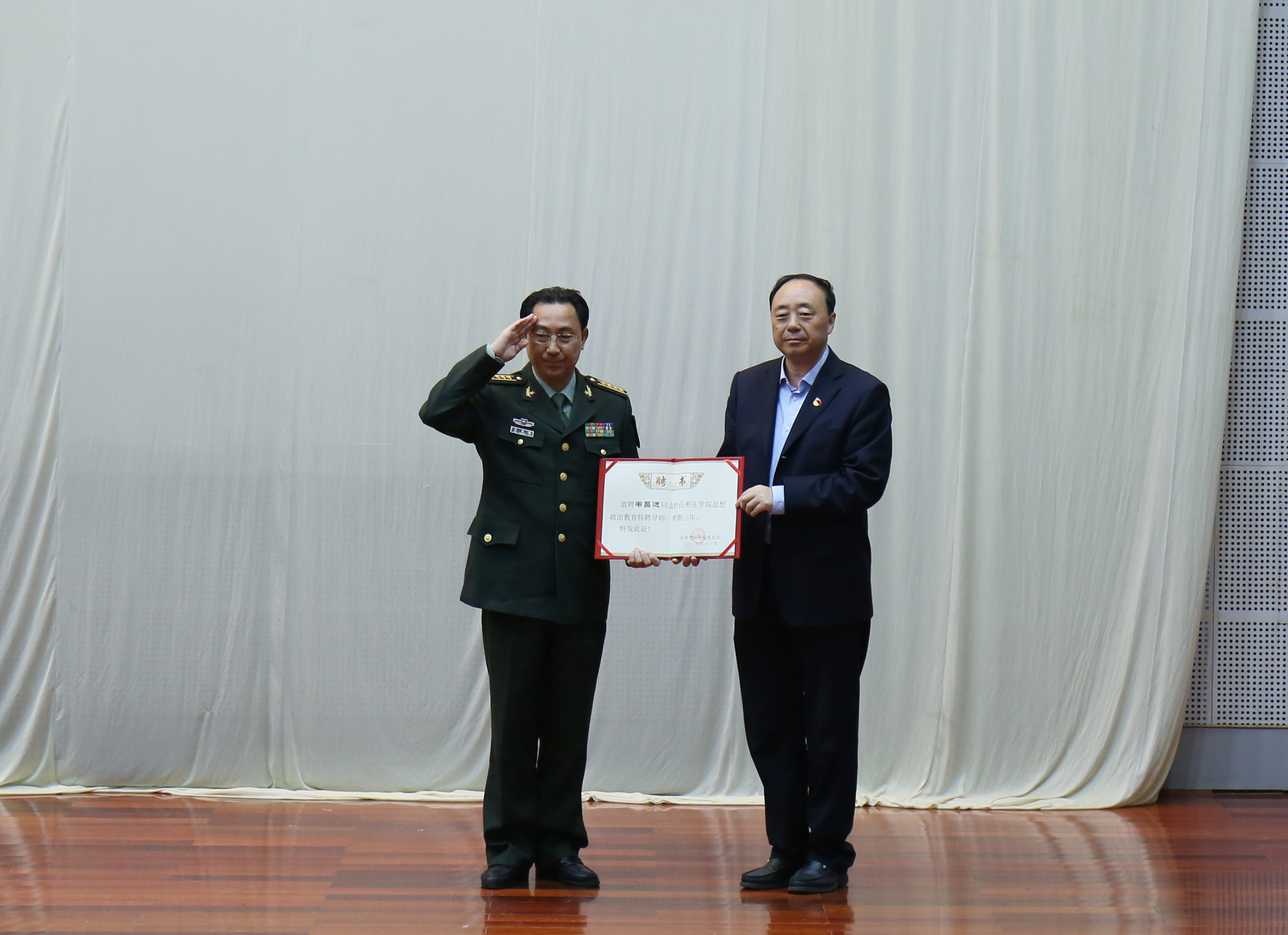 报告会前,校党委书记曹胜强代表学校向战斗英雄、首届“八一勋章”获得者韦昌进颁发聘书,隆重聘请韦昌进为我校思想政治教育特聘导师。