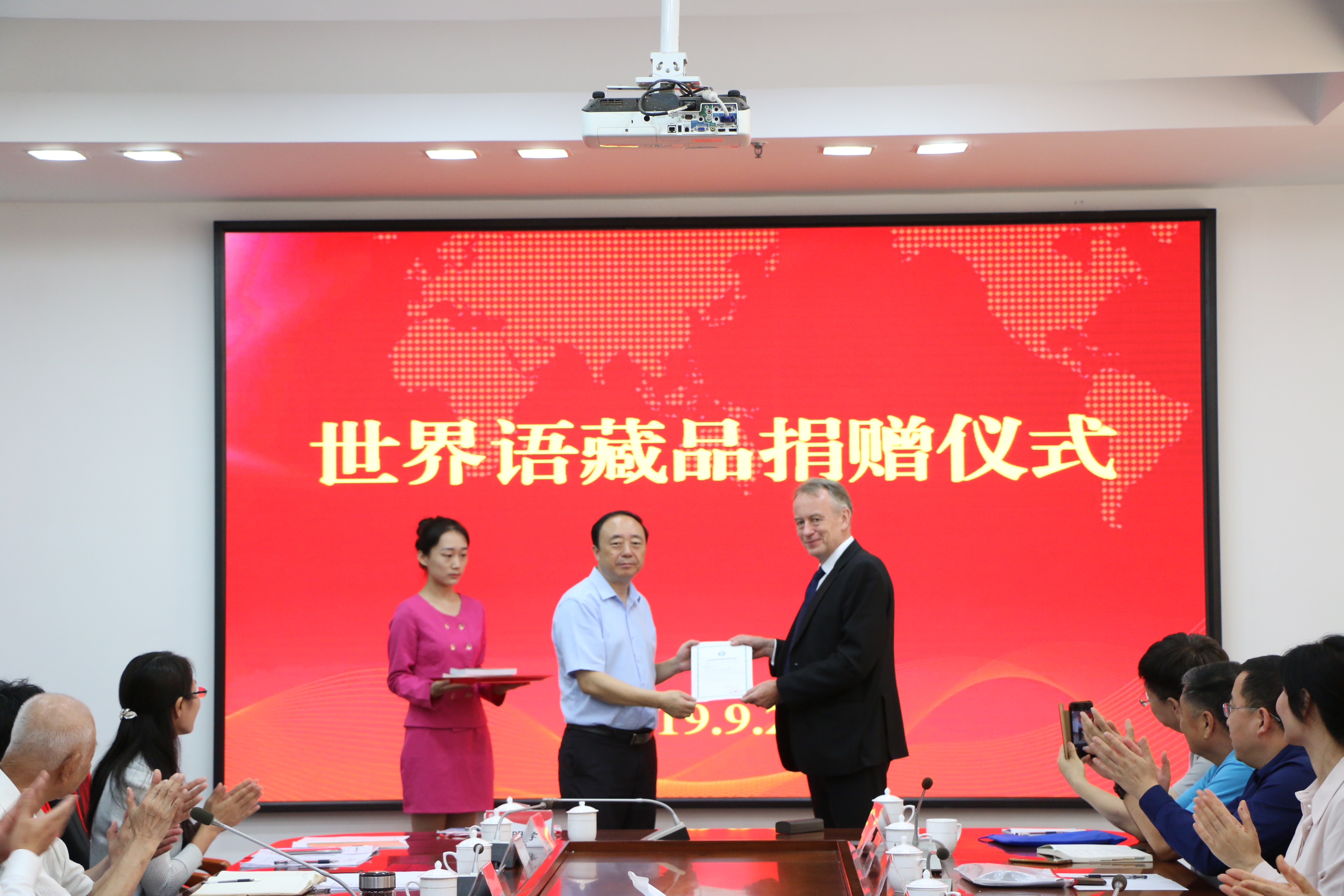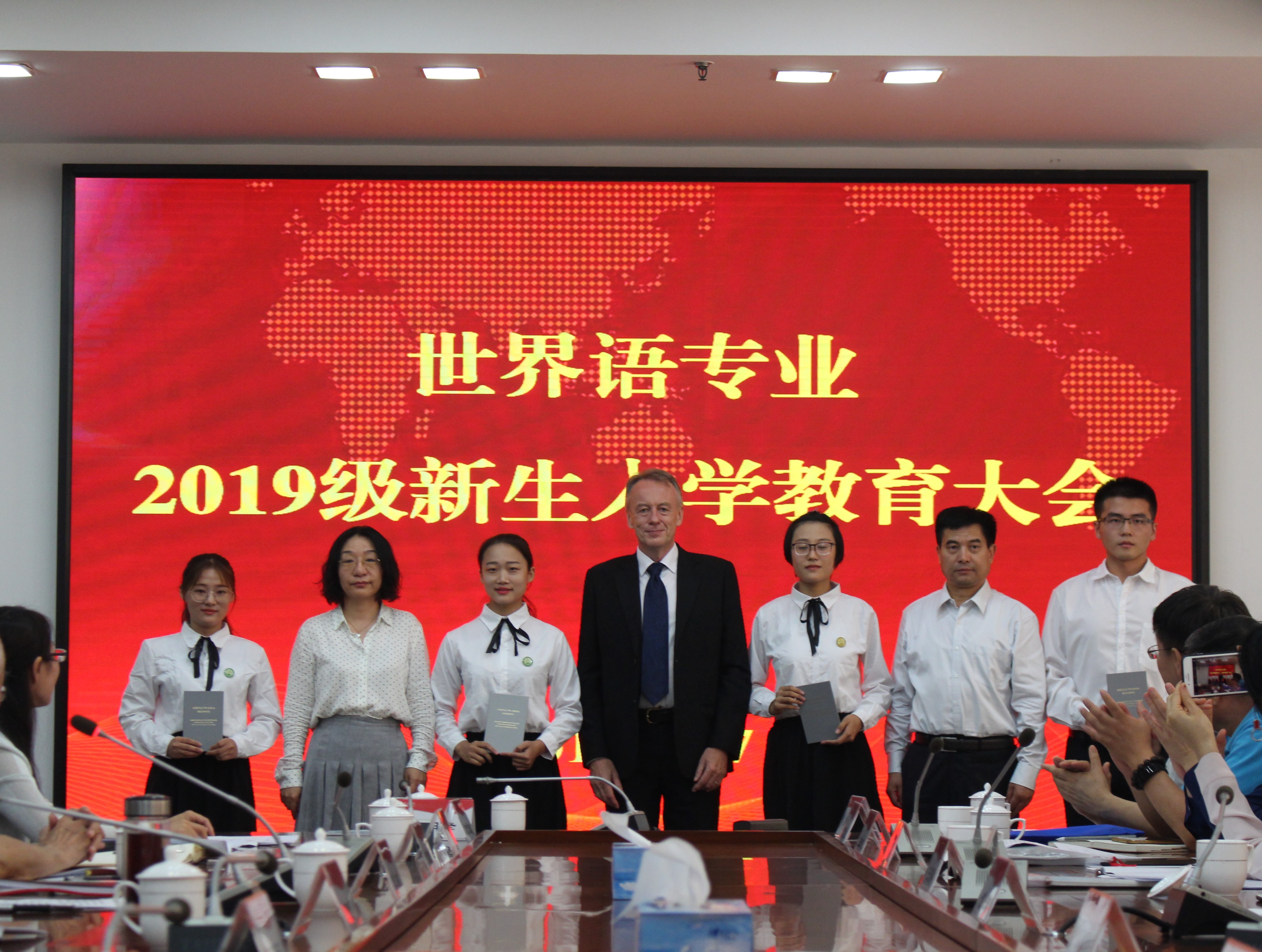 9月27日上午,冰岛驻华使馆原公使拉格纳尔·鲍德松先生世界语藏品捐赠仪式暨世界语专业新生入学教育在综合楼三楼会议室隆重举行。拉格纳尔·鲍德松先生及夫人陈明、女儿白云,中国报道社总编辑赵珺,中华全国世界语协会副会长兼秘书长王瑞祥,中国报道杂志社网络部主任、国际世界语协会A级委员、中华全国世界语协会常务理事陈吉,中华全国世界语协会副秘书长蒋利民,中国报道社网络部记者康偲倛,上海市世界语协会会长、上海外语音像出版社总编辑周天豪,中华全国世界语协会副秘书长、江苏省世界语协会副会长兼秘书长张常生,山西太原柏杨树街小学校长、国际世界语教师协会中国分会会长魏玉斌,中华全国世界语协会常务理事、厦门世界语学会副会长、厦门雪瑞工艺品有限公司董事长余细妹,苏州市科普促进中心主任朱利荣,北京艾立特教育有限公司董事长、北京涉外经济学院、日本日中文化艺术专门学校副校长、国际世界语教育研究院(筹)主席谢龙飞出席会议,来自波兰、日本、韩国的世界语者和我校相关部门负责人、2019级世界语专业师生参加了会议。
