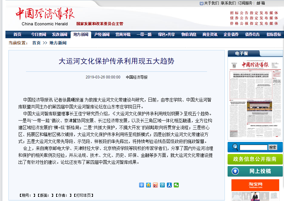 中国经济导报的报道,彰显了第四届中国大运河智库论坛的学术价值,也充分体现了我校承办大型学术会议的能力和影响力。