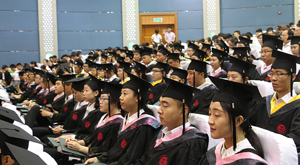 综合楼学术报告厅内,乐曲悠扬,师生们欢聚一堂,与2017届毕业生共同经历这一人生盛典。毕业生同学们头戴学位帽,身着学位袍,一张张青春洋溢的笑脸使得整个大厅弥漫着欢乐的气氛。