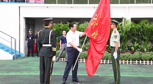 党委书记胡小林为军训团授旗。