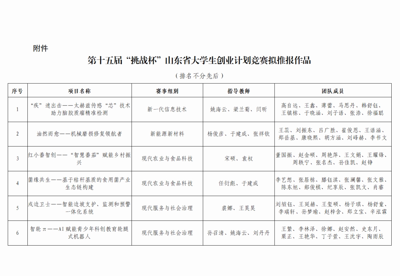 根据《关于举办第十五届“挑战杯”山东省大学生创业计划竞赛的预通知》要求,经学院推荐、校内初审、网络评审、专家评议等环节,拟推荐以下6件作品参加第十五届“挑战杯”山东省大学生创业计划竞赛,现将名单予以公示(排名不分先后)。