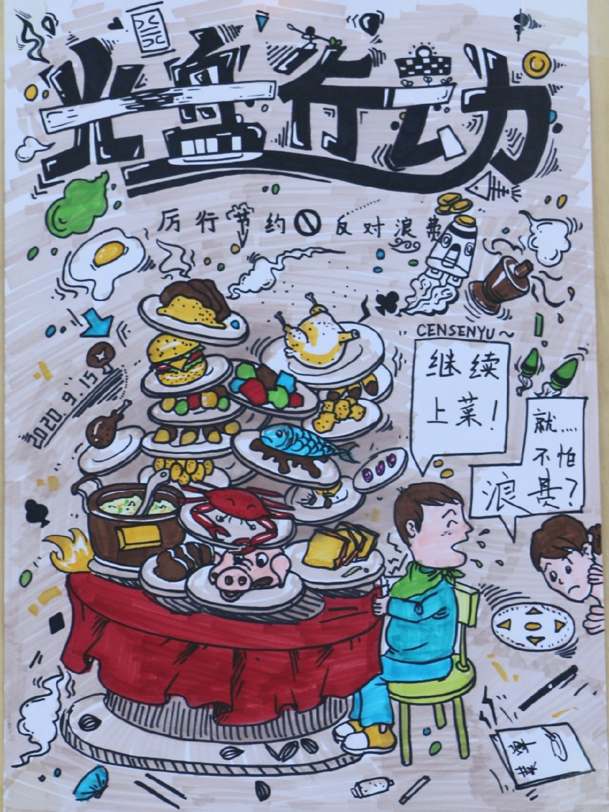 活动以“厉行节约,反对浪费”为核心展开,共分为照片墙,绘制类作品两个活动展览板块。其中“厉行节约”打卡照片墙,采用线上打卡方式,进行自我管理,切实帮助学生培养节约习惯。手抄报、板报、漫画等绘制类作品充分发挥专业特长,展现美院专业特色,在带给同学们视觉冲击的同时达到倡导节约的目的。