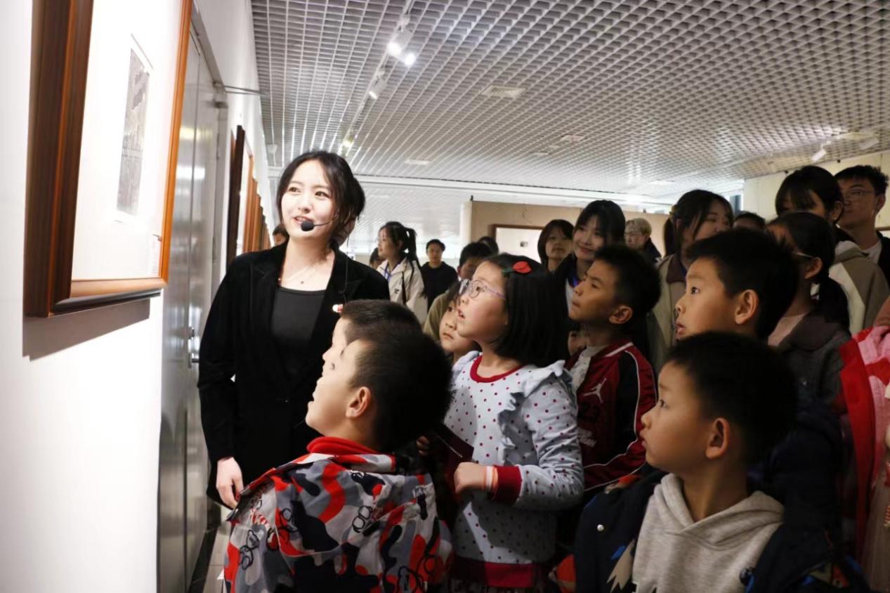 活动从参观“国家艺术基金2023年度传播交流推广资助项目‘画笔为枪 民族救亡’弘扬抗战精神主题连环画展”开始,在讲解员的带领下,小朋友们一起欣赏《狼牙山五壮士》、《红枪绘》等红色版画作品,与讲解员积极互动,缅怀革命先烈,重温烽火岁月。志愿者们充分发挥专业优势,带领小朋友们一起开展了书法、团扇绘制、剪纸、陶艺、篆刻等趣味十足的美育小课堂。志愿者化身“小老师”,通过“一对一”的结对辅导机制,带领小朋友们完成了丰富多彩的手工艺术作品。