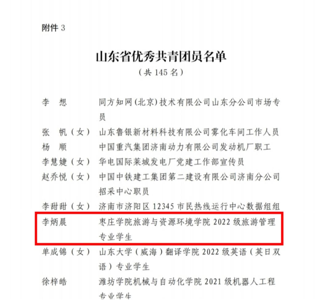 近日,共青团山东省委公布《关于表彰2023-2024年度“山东青年五四先进集体“山东青年五四先进个人”的决定》,我校旅游与资源环境学院2022级旅游管理专业学生李炳晨荣获“山东省优秀共青团员”荣誉称号。