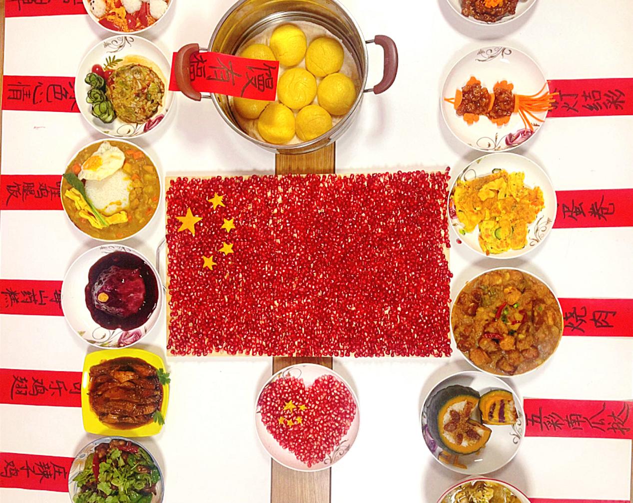 本次大赛共64名同学、39道作品参赛。比赛现场,香气四溢,热闹非凡。展台正中央一幅由石榴籽铺就的五星红旗徐徐展开,凝聚了支教团学子对祖国母亲最美好的祝愿与祝福。一道道精心烹饪的美食陆续登场,次第花开。选手们通过煎、炒、蒸、焖,将对祖国的热爱,对援疆支教的热情融入菜肴,用美食表达对生活的态度,用创新表达对未来的展望。