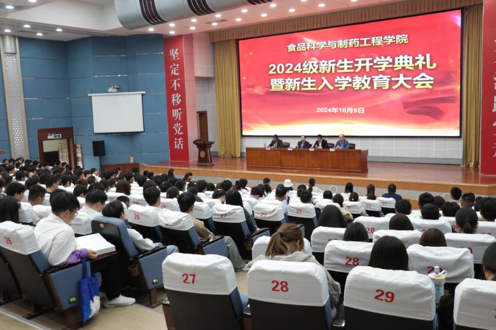 秋风为序启征程,筑梦扬帆谱新章。10月9日下午,食品科学与制药工程学院在综合楼报告厅隆重举行2024级新生开学典礼暨新生入学教育。学院党政领导,全体辅导员、教学科研办公室主任、实验中心主任、新生班主任、教师代表及2024级全体新生参加了开学典礼。