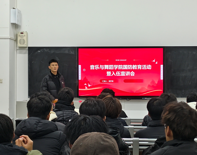 为扎实开展国防教育,弘扬爱国主义精神,激发青年学生爱国热情,培养国防意识,并进一步贯彻落实国家大学生征兵入伍政策,音乐与舞蹈学院于11月28日晚在德艺楼108教室开展“2024年度国防教育活动暨征兵政策宣讲会”,各年级有意向入伍的同学参加,本次活动由学院退役士兵周宇宸主持,邀请多位退役士兵进行宣讲。
