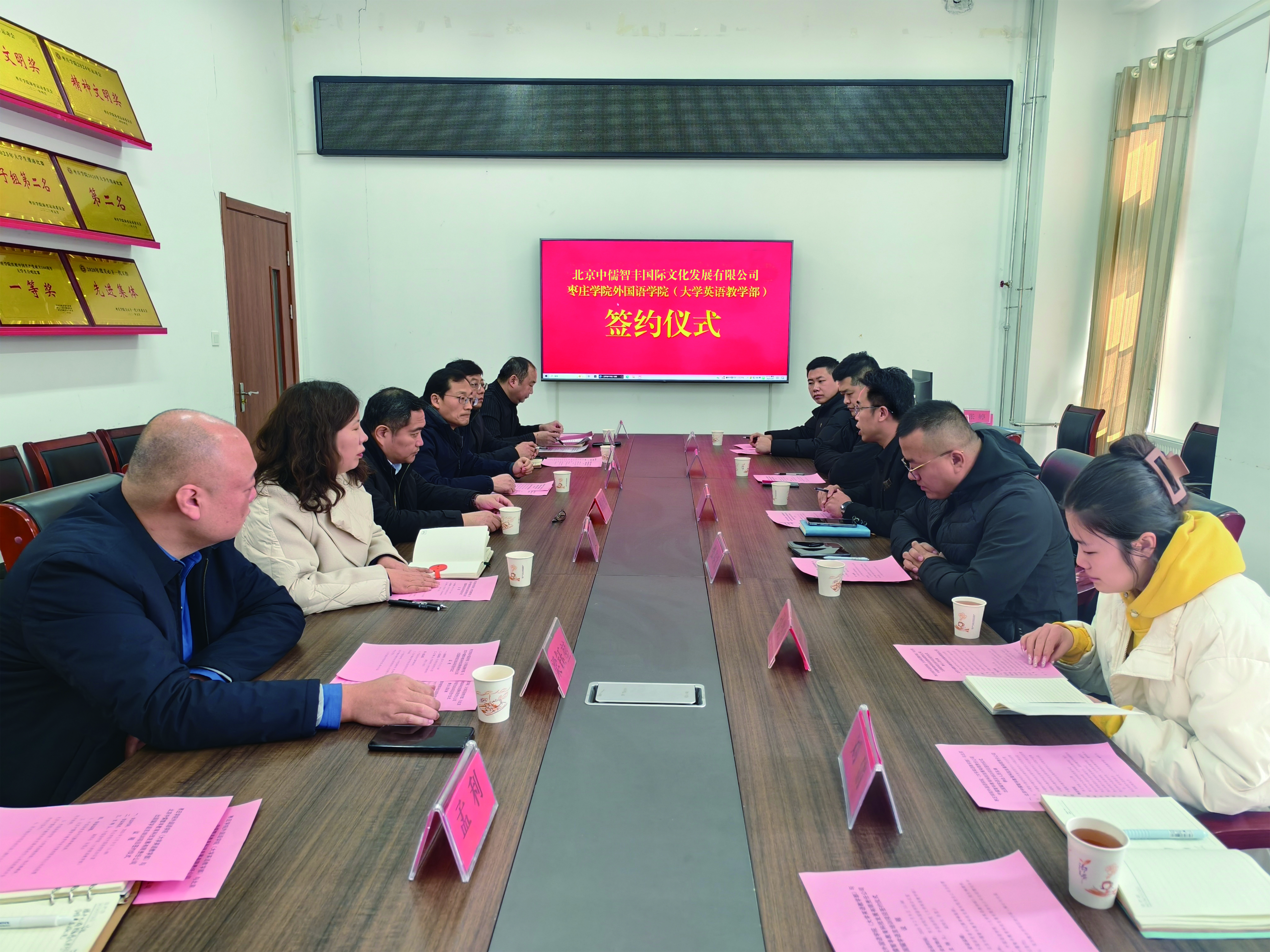 2月9日上午,外国语学院(大学英语教学部)在薛城校区豁然楼A102会议室与北京中儒智丰国际文化发展有限公司举办海外留学与语言培训项目签约仪式。北京中儒智丰国际文化发展有限公司总经理刘丰、副总经理张春雷,校工会主席盛清银,国际交流处副处长、国际教育学院副院长梁钰堃,学院党委书记滕聿峰、院长韩建侠及其他党政领导、相关教师一同出席仪式。