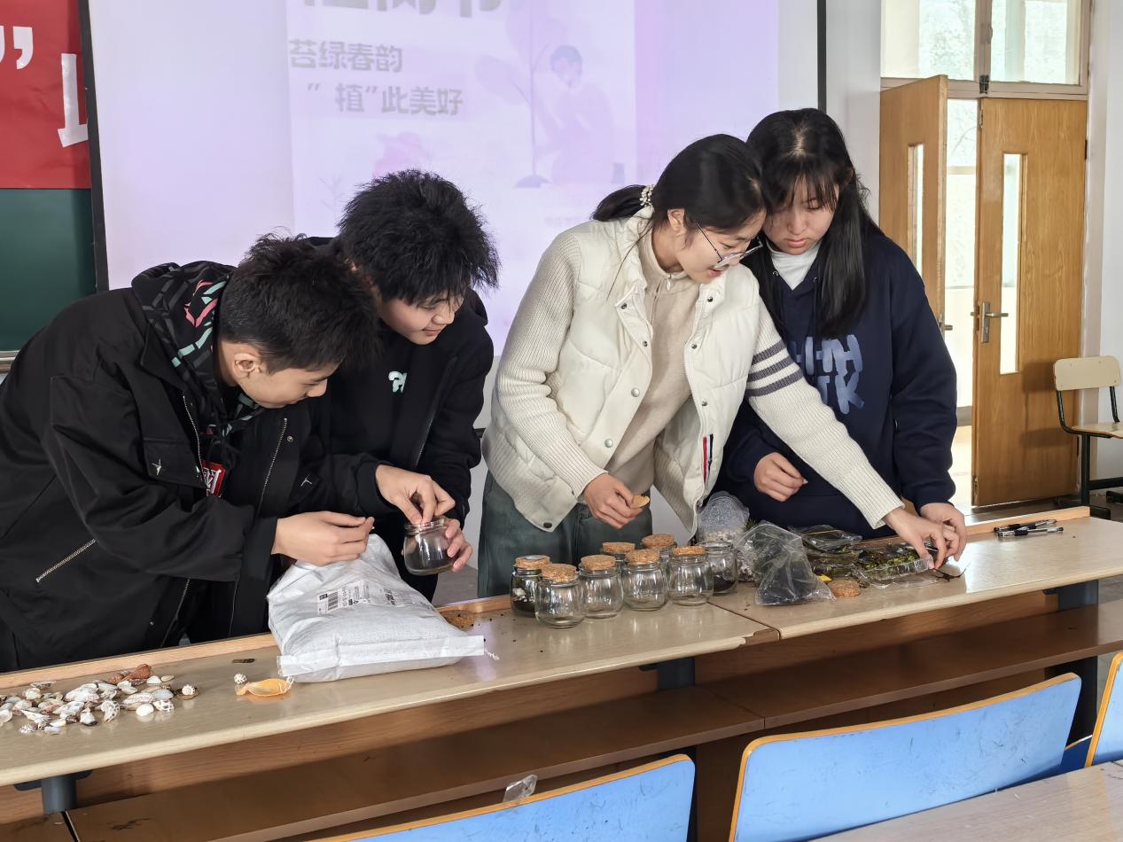 本次系列活动共设“‘树’说校史”“以废换绿”“种植打卡”“创意实践”四大主题,吸引了全校学生广泛参与。“枣创新生,‘树’说校史”活动以校园树木为载体,面向全校征集与树木相关的作品,用树木故事讲述枣院文化记忆,成为传承校园文化的精神纽带。“绿动三月,与苗共长”种子盲盒打卡行动将持续21天,通过线上平台分享、线下展示的方式激励学生感悟生命的力量。“以废换绿”是同学们以废品兑换绿植,废品售卖后将赠与枣庄市儿童福利院。此外,“创意实践”则是用苔藓、球藻制作微景观,激发同学们的生态创意。