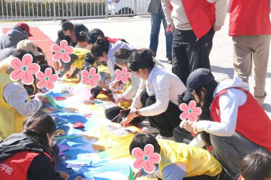 志愿者们与孤独症儿童通过“气球接力”互动游戏迅速打破隔阂,孩子们勇敢伸手接过球,通过接力互动拉近了彼此之间的距离,让孩子们敞开心扉。随后,志愿者们带领孩子在百米长卷上共同开展“我的蓝色美丽世界”绘画创作,美术专业的志愿者充分发挥专业优势,悉心讲解绘画知识与技巧,现场示范晕染技法和剪贴技巧,孩子们手持五彩画笔,用线条与色彩来表达内心世界,通过触觉感知教学法帮助触觉敏感儿童体验颜料质感,运用艺术绘画原理浸润孩子们的内心。