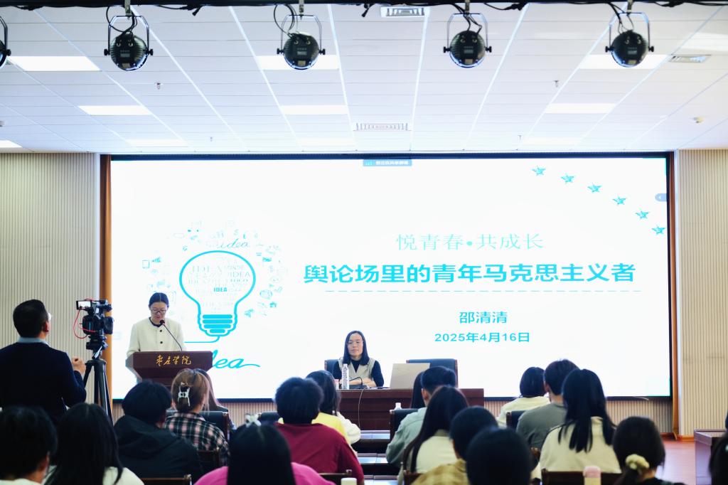 仪式结束后,学校党委宣传部宣传教育科科长邵清清以“‘悦青春•共成长’舆论场里的青年马克思主义者”为题讲授开班第一课。邵清清结合自身经历及丰富的现实案例从意识形态的概念意义、互联网背景下意识形态安全、多样化社会思潮冲击下青年大学生应如何应对等三个方面展开了报告讲解。报告现场氛围融洽,频频互动,在座学员纷纷表示作为青年学生骨干更应提升网络安全意识,以实际行动捍卫我们的思想阵地,为实现中华民族伟大复兴的中国梦贡献力量。