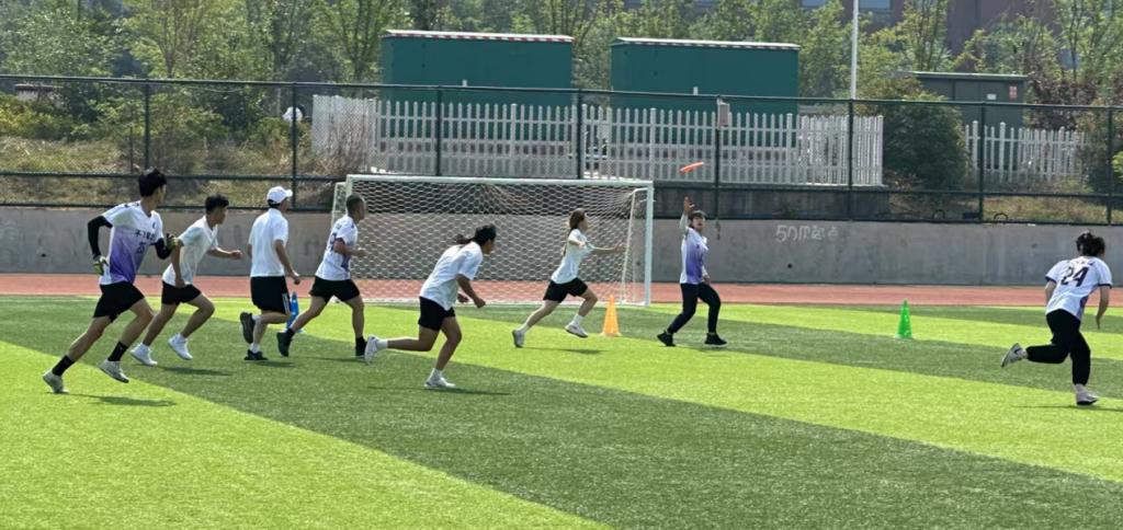 各参赛队伍上场7人,4男3女,在绿茵场上展开激烈比拼。运动员们默契配合、奋力拼搏,精准的传盘、灵活的跑位、精彩的防守赢得现场观众阵阵喝彩。比赛采用小组循环的模式,开赛后,一方通过传盘推进,接盘者需在停步后固定位置传盘,不得跑动。当飞盘传入对方得分区且队友成功接住即得分,比赛计时进行,终场时得分高的队伍获胜,过程充满速度与策略的对抗。