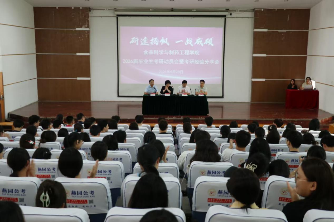 为帮助2026届学子明确考研目标,科学规划考研复习路径,坚定备考信心,5月28日,食品科学与制药工程学院在市中校区文科楼报告厅举办“研途扬帆,一战成硕”考研经验交流分享会。学院党政领导、辅导员、班主任、2025届考研上岸优秀学生代表及2026届全体学生共同参与。