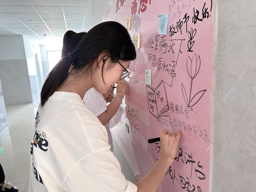此外,在学生“一站式”社区设有“师恩涂鸦墙”,也吸引了很多同学参与,一句句“老师,您辛苦了”“祝您节日快乐”凝聚成爱的回响。