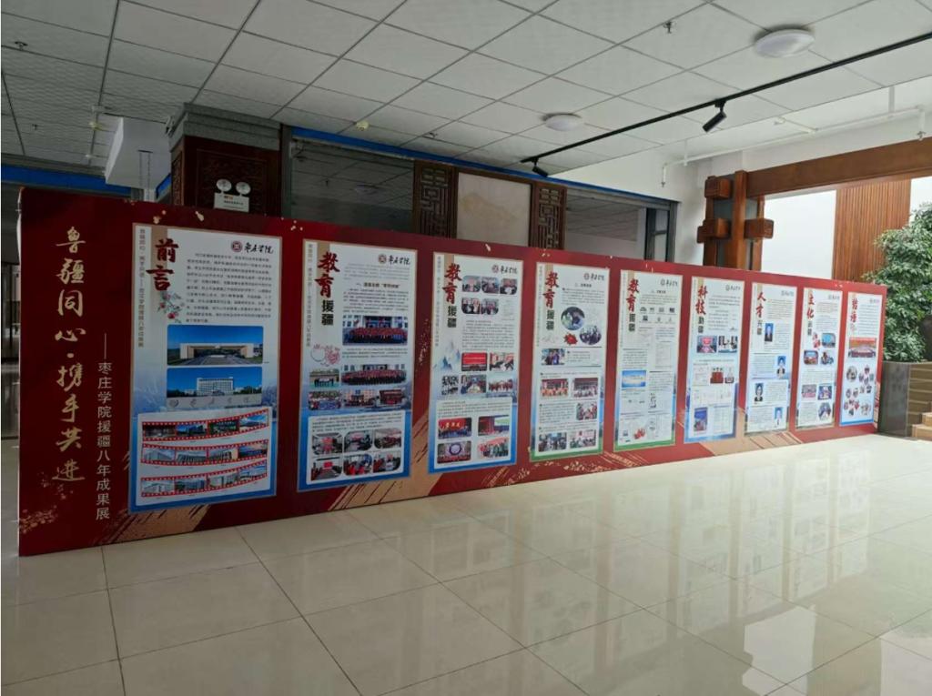 成果展以“鲁疆同心、携手共进”为主题,涵盖教育援疆、科技助疆、人才兴疆、文化润疆四个板块,系统展示了我校自2018年9月以来,积极响应国家援疆号召,持续选派优秀师生赴喀什地区开展援疆工作的历程与成效,充分展现了鲁班应用技术学院教工党支部书记张立华带领团队落实高校“双带头人”教师党支部书记“强国行”专项行动,服务支持边疆地区教育事业发展的系列成果,进一步擦亮了援疆“枣院品牌”。