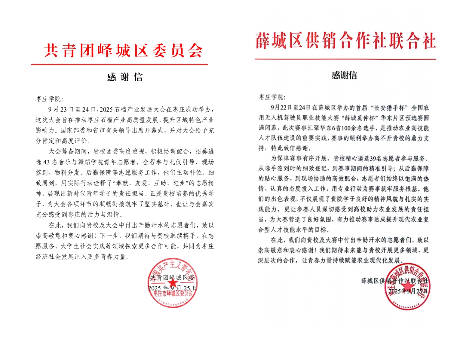 近日,在“2025石榴产业发展大会”和“首届‘长安猎手杯’全国农用无人机驾驶员职业技能大赛‘薛城奚仲杯’华东片区预选赛”两项省级重点赛会活动圆满落幕后,学校相继收到共青团峄城区委员会、薛城区供销合作社联合社两家单位发来的感谢信,信中对学校青年志愿者全程参与赛事服务的专业表现、责任担当给予高度肯定,并对志愿服务为赛会高效运转提供的坚实保障致以诚挚感谢。