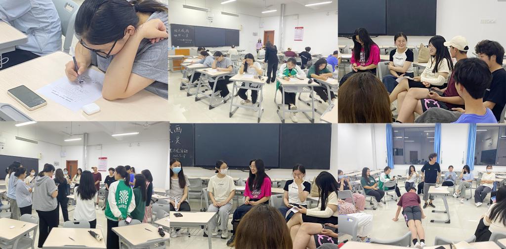 本次活动,从2021、2022级抽取部分不同性格的同学,以“假如生命中有一个黑点,它们代表缺点、遗憾等,如何在此基础上,转换成快乐与幸福”为题,在舒缓的背景音乐下同学们以自己的所思所想所悟进行创作,通过点线面等艺术表现形式将思想具象化到纸面上。在互动环节中,同学们通过分享彼此画作的创作理念,更好的了解了性格迥异同学们的多角度思维方式,更多面化的认识了自己。正如同学们的作品中所述“走过阻碍前行悲伤难过的天桥,我们终会走进向往的宁静或繁华的世界。”