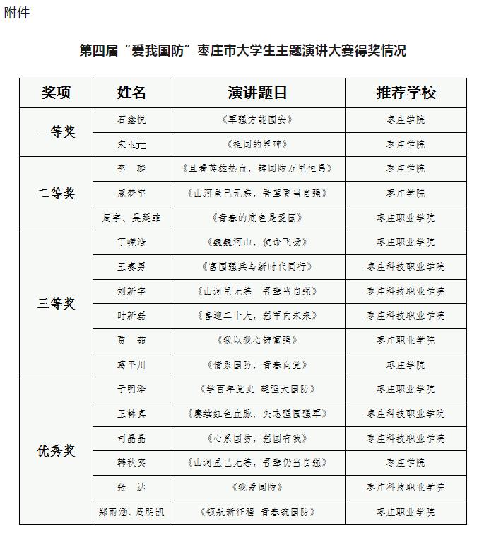 近日,由枣庄市委宣传部、团市委、市教育局、枣庄军分区政治工作处等部门联合举办的第四届“爱我国防”枣庄市大学生主题演讲大赛结果公布。我校推荐学生6名,获奖6名。其中,一等奖2名;二等奖2名;三等奖1名;优秀奖1名。