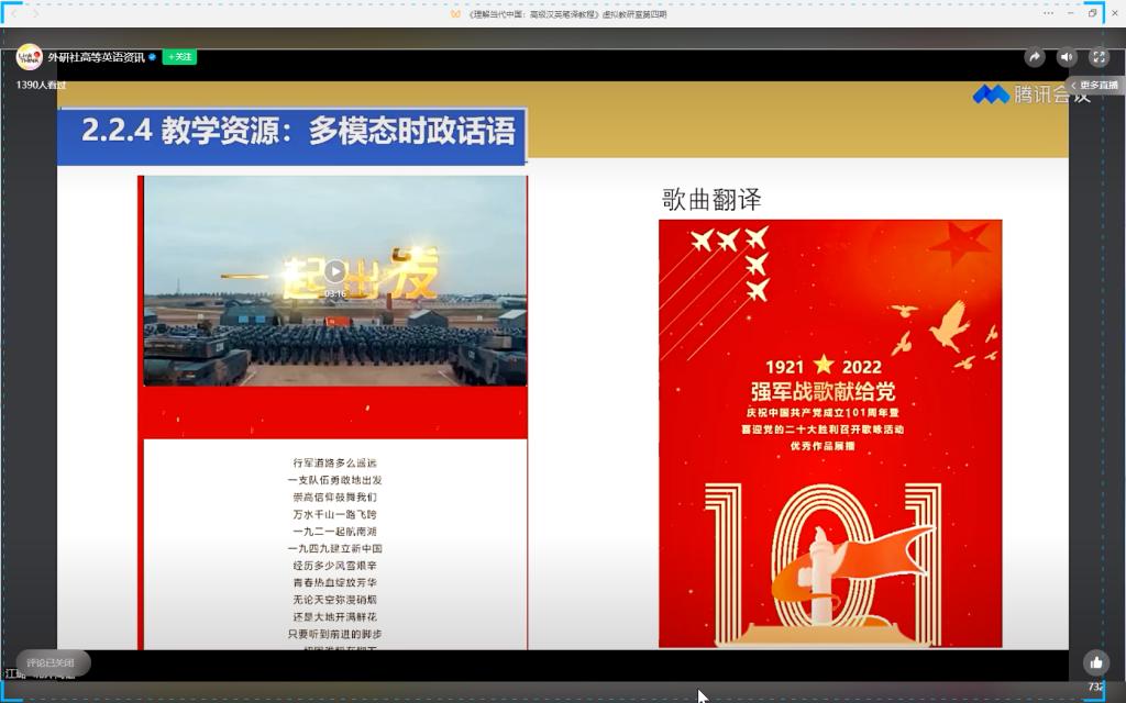 高等学校“理解当代中国”系列教材虚拟教研室活动旨在持续帮助任课教师深入理解教材编写理念,准确把握教材核心内容,及时交流教材教学方法。新一轮教研活动启动以来,学院教师按照要求通过在线方式参加了英语系列教材虚拟教研室4期教研活动:《理解当代中国:英语演讲教程》《理解当代中国:高级汉英笔译教程》《理解当代中国:汉英翻译教程》《理解当代中国:英语读写教程》虚拟教研室。在活动中,教师聆听了系列教材编审专家结合具体授课单元及真实教学案例讲解的教学设计思路,直观了解了高等学校“理解当代中国”系列教材在真实课堂中的应用模式。