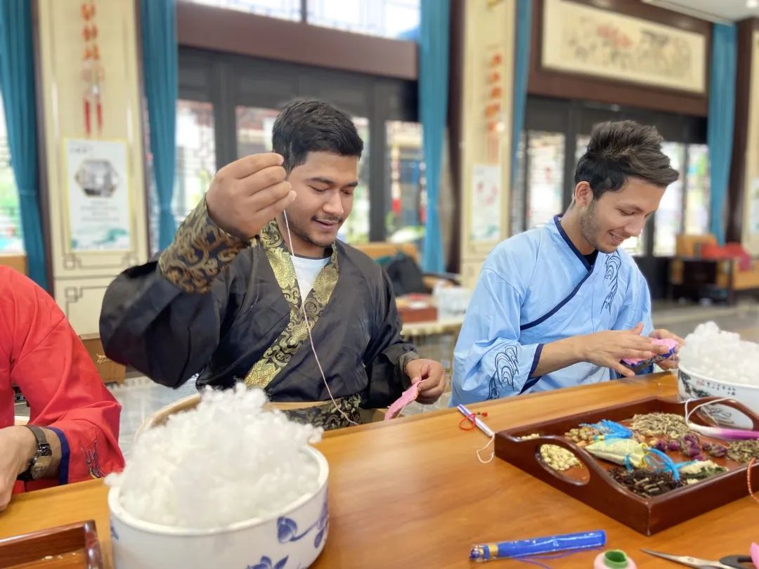 在薛城区江南里社区,留学生们身着汉服,徜徉在如诗如画的亭台水榭间,时而相互拍照留念,时而驻足欣赏业主们精彩的地方戏曲演唱和民乐表演。在社区活动中心,留学生们跟着热心业主学习缝香囊、包粽子,了解屈原的故事和中国传统端午习俗;拿着亲手缝制的香囊,饶有兴致地向表演者们学习中国传统的问候礼仪,相互作揖行礼,互道端午安康。下午,在铁道游击队纪念馆,留学生们听讲解员讲述中国共产党领导下的游击队员在枣庄这块红色热土上抗击日本侵略者的故事,最后,在凤凰绿道沿途美丽的石榴花海中结束一天的体验活动。