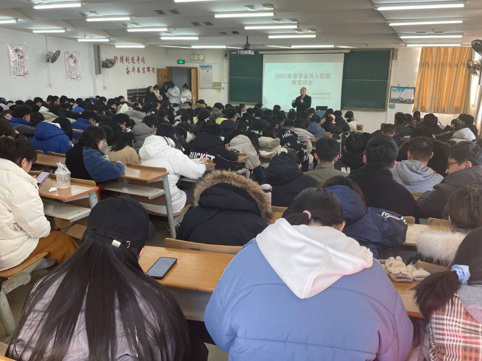 12月27日上午,化学化工与材料科学学院在综合楼1213教室召开2022年春季征兵入伍政策宣讲会,2022届毕业生共300余人参加宣讲会。
