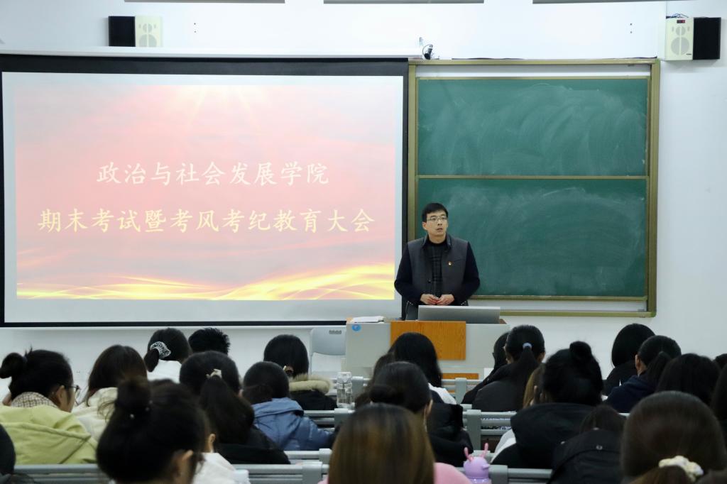 期末将至,为加强学风、考风建设,营造公平公正的考试氛围,12月24日下午,政治与社会发展学院在增信楼121教室召开期末考试暨考风考纪教育大会,2021级全体学生参加会议。