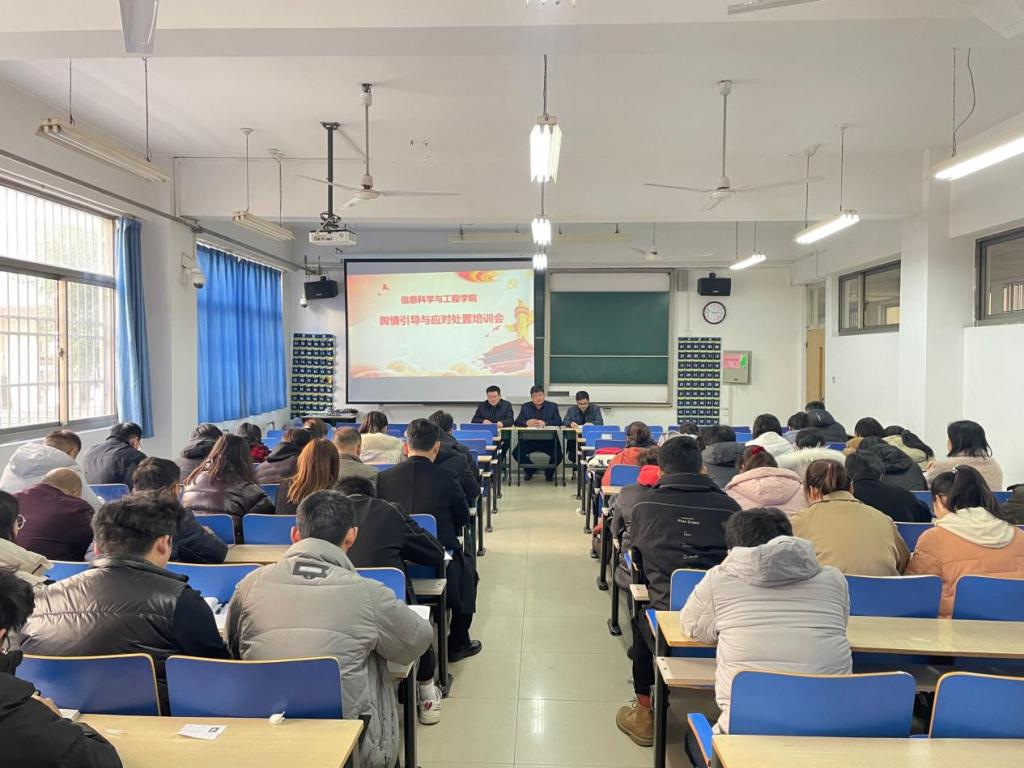 为进一步加强我院舆情应对与应急处置能力,12月20日下午,信息科学与工程学院在理工楼2108教室召开舆情引导与应对处置专题培训会。学院党政领导、全体教职工参加会议。