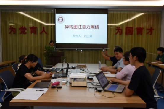 院计算机视觉与数据挖掘创新团队的刘三荣副教授做了题为《异构图注意力网络》的学术报告。报告对图神经网络、注意力机制面临的现状做了分析,指出包含不同类型节点和链接的异构图是图神经网络的难点,从而针对性地提出一种基于层次注意的新型异构图神经网络,包括节点级和语义级注意力。节点级注意力关注节点与邻居之间的重要性,语义级注意力关注不同元路径的重要性,分层聚合则基于元路径的邻居的特征来生成节点嵌入。通过实验证明该模型具有良好性能和可解释性。