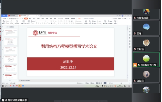 12月14日下午,传媒学院举办首期青年学者学术论坛。学院副教授刘时坤博士作了题为“利用结构方程模型撰写学术论文”的学术报告。传媒学院全体教师参加线上报告会。