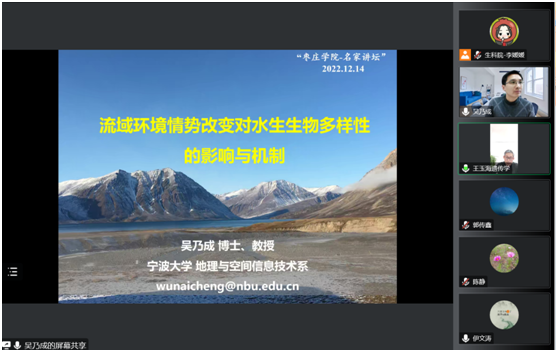 为进一步强化学术交流与合作,12月14日下午,由科技处主办、生命科学学院承办的“名师大讲堂”第十七讲学术报告活动通过腾讯会议成功举办。欧盟“玛丽•居里”学者、洪堡学者、宁波大学“浙东学者”吴乃成教授应邀作了题为《流域环境情势改变对水生生物多样性的影响与机制》的学术报告。