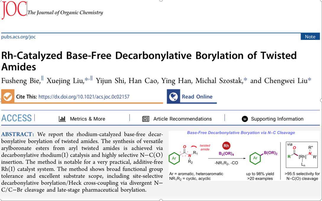 近日,鲁南煤化工工程技术研究院刘雪静科研团队在铑催化的扭曲酰胺的脱羰硼酸化反应方面取得最新进展,相关工作发表在国际著名期刊《The Journal of Organic Chemistry》上,论文题目为《Rh-Catalyzed Base-Free Decarbonylative Borylation of Twisted Amides》,别福升博士为第一作者,刘雪静教授为通讯作者,DB中国旗舰官方网站为第一单位。