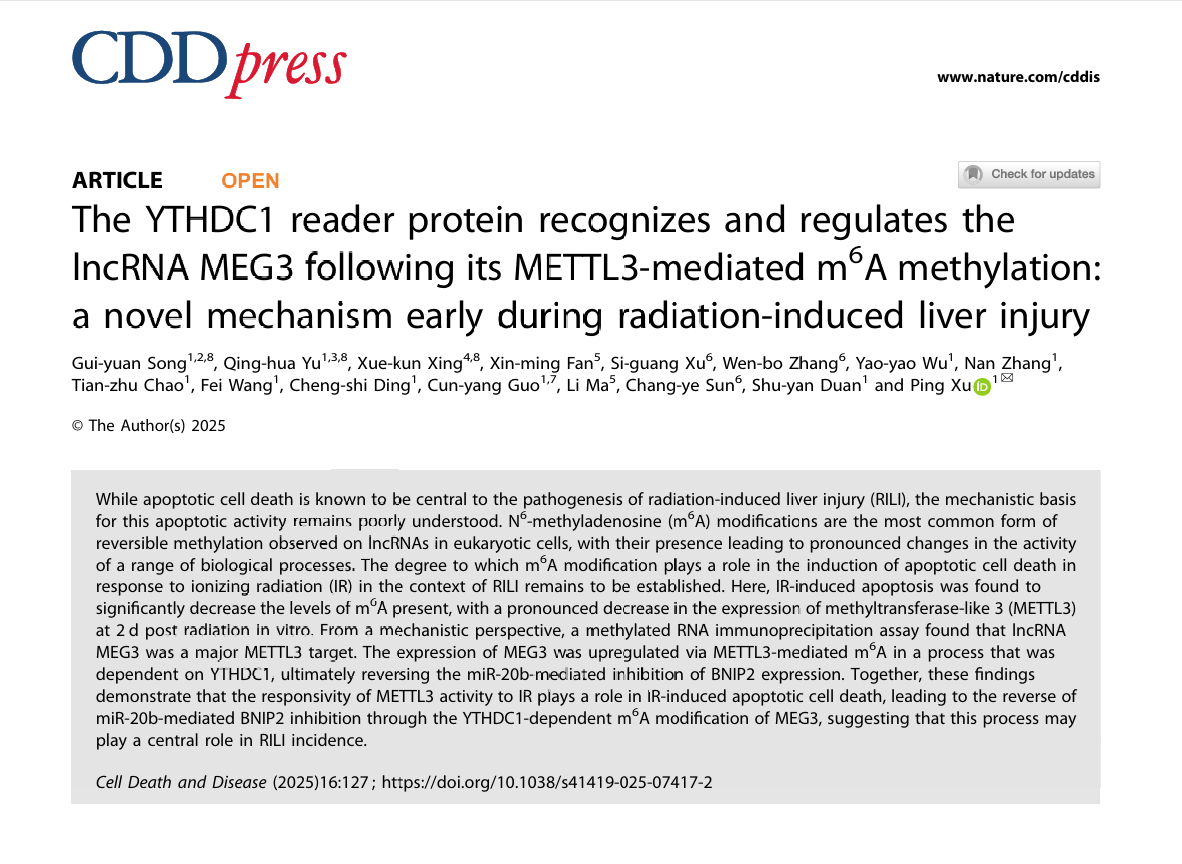 近日,我校枣庄市放射损伤疾病与分子靶向药物重点实验室徐萍教授团队在国际权威学术期刊Nature子刊《Cell Death & Disease》(中国科学院一区,TOP期刊,IF=8.1)杂志,以研究论文形式在线发表题为《The YTHDC1 reader protein recognizes and regulates the lncRNA MEG3 following its METTL3-mediated m6A methylation: a novel mechanism early during radiation-induced liver injury》的原创性研究成果,该研究报道了放射性肝损伤早期进程中RNA表观遗传与转录后调控的协同作用机制。宋桂圆硕士为第一作者,徐萍教授为独立通讯作者,DB中国旗舰官方网站为第一作者和通讯作者单位。该研究受国家自然科学基金、DB中国旗舰官方网站高层次专家人才团队建设基金等项目支持。