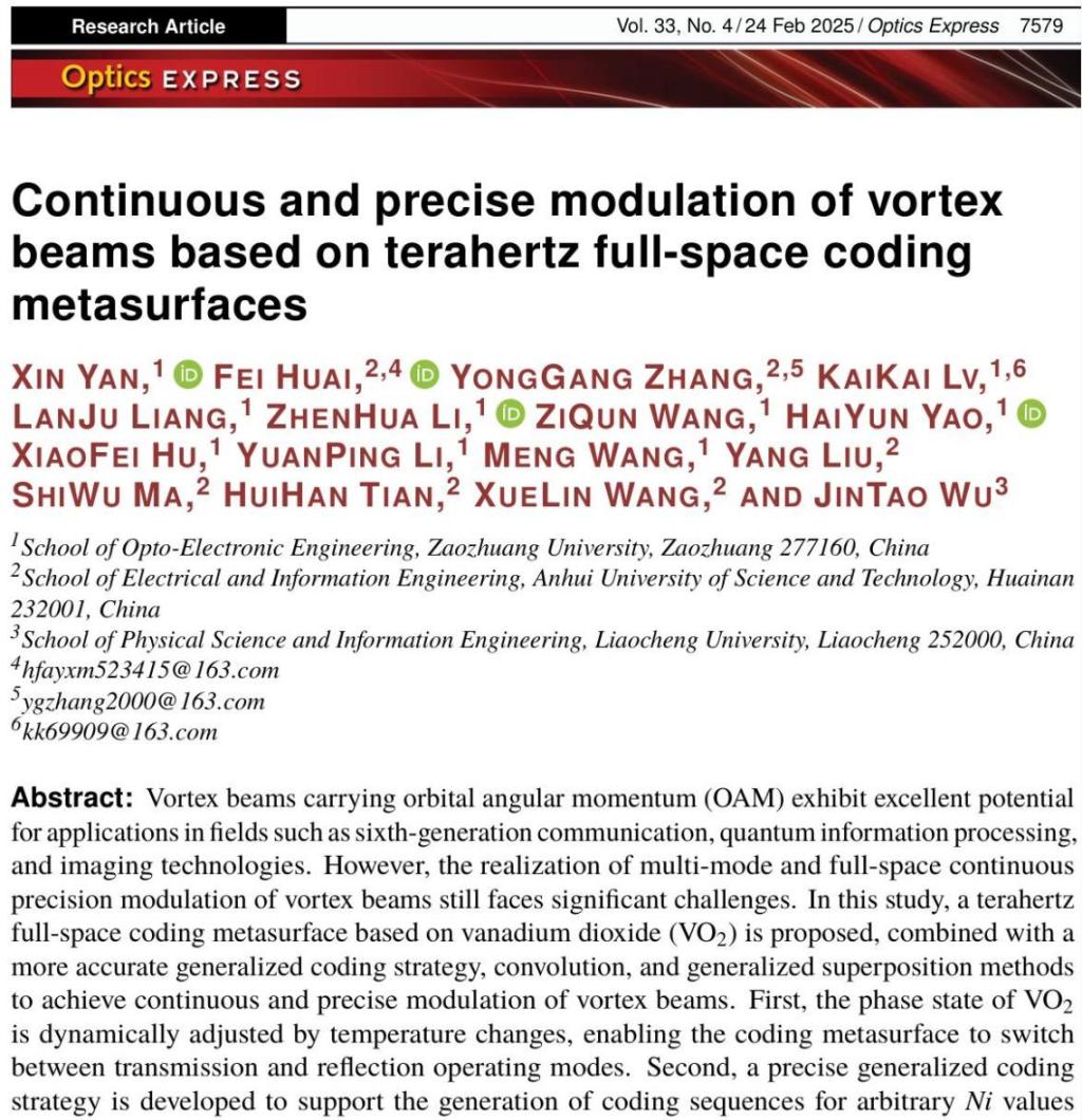 近日,我校光电工程学院太赫兹团队闫昕教授以“Continuous and precise modulation of vortex beams based on terahertz full-space coding”为题在《Optics Express》发表最新研究成果。该成果设计了一种基于太赫兹全空间编码超表面的选择性高容量智能通信和高分辨率成像平台。