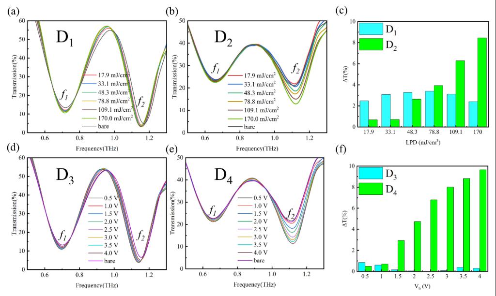 该器件基于图案化GaN/石墨烯异质结与超表面集成。通过光调制与电调制两种方式,将低功率密度的泵浦光与微弱偏置电压施加于该器件上,从而改变了异质结的肖特基势垒,进而调控异质结的电导率,实现了对太赫兹波的高灵敏、多维动态调制。在光功率达到170.0 mW/cm2 或偏置电压为4.0 V时,调制效果显著,最大振幅调制深度可达93%. 本研究展现了太赫兹波调制的定量可控性,并揭示了石墨烯费米能级狄拉克点附近受外部诱导变化的关键作用,为超高灵敏度的主动调制光子器件提供了坚实的平台。
