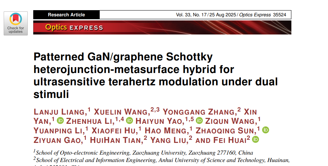 近日,我校光电工程学院微纳制造与太赫兹山东省工程研究中心梁兰菊教授课题组设计了一款图案化GaN/石墨烯异质结与超表面集成的光电敏感器件,实现了93%的振幅调制和40°相位调制。研究成果以“Patterned GaN/Graphene Schottky Heterojunction-Metasurface Hybrid for Ultrasensitive Terahertz Modulation under Dual Stimuli”为题发表在 OPTICS EXPRESS 期刊上。