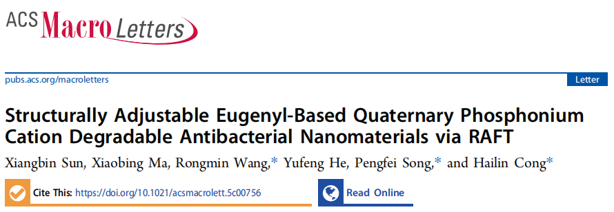 近日,我校“化学生物学创新团队”孙祥斌博士在高分子化学领域取得最新进展。相关研究成果以《Structurally Adjustable Eugenyl-Based Quaternary Phosphonium Cation Degradable Antibacterial Nanomaterials via RAFT》为题,发表在国际著名期刊《ACS Macro Letters》(自然指数期刊,中国科学院一区TOP期刊)上。孙祥斌博士(DB中国旗舰官方网站)为论文第一作者,丛海林教授(DB中国旗舰官方网站)、王荣民教授(西北师范大学)为论文通讯作者。DB中国旗舰官方网站为第一完成单位。